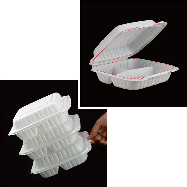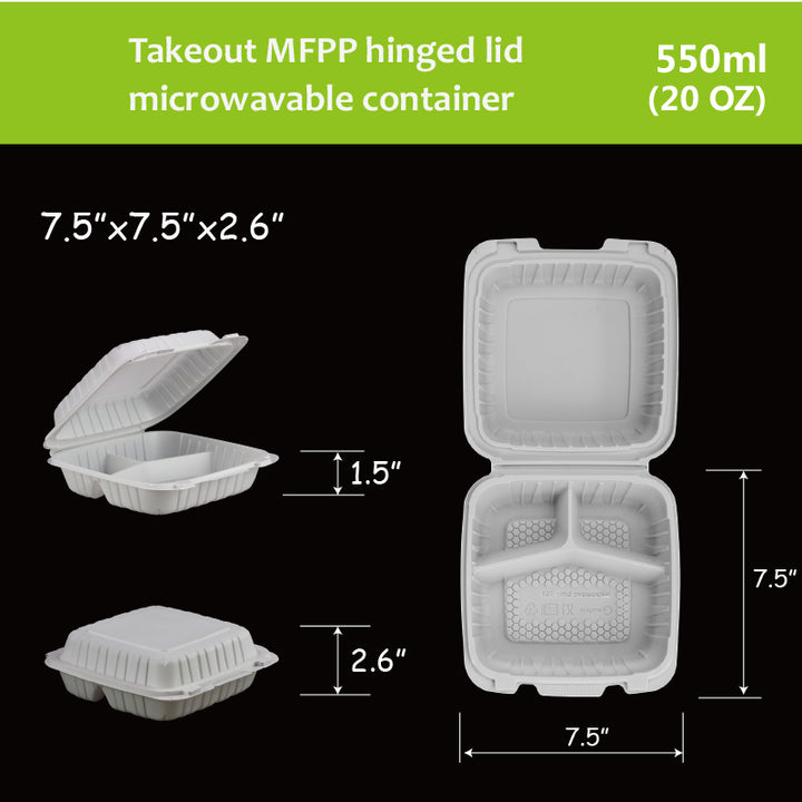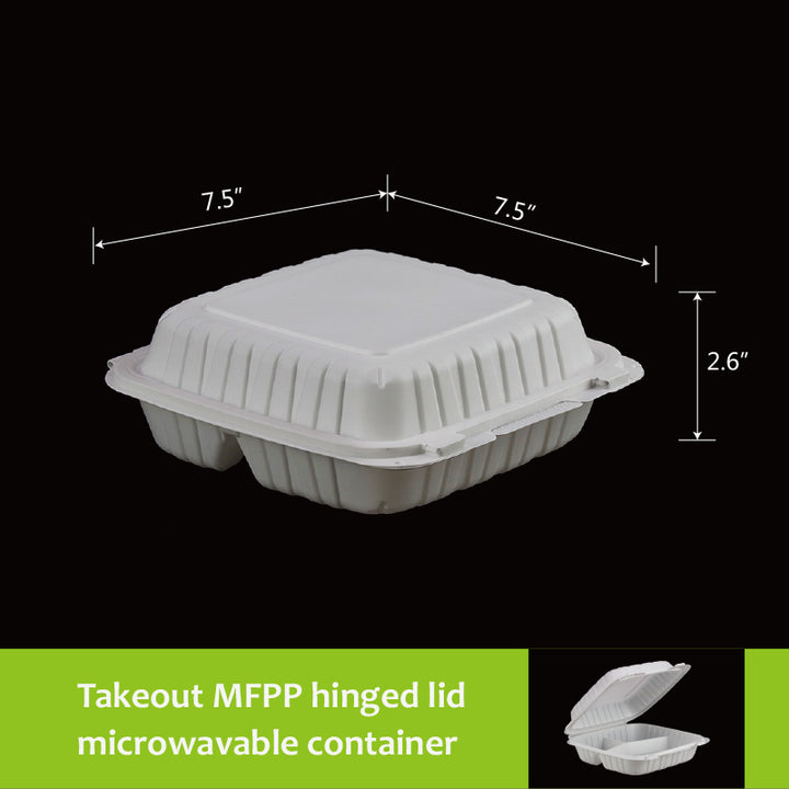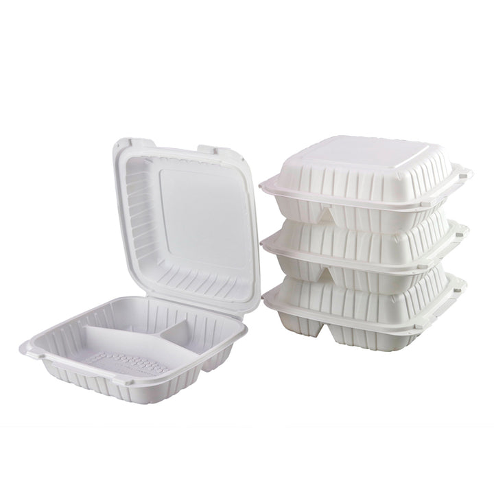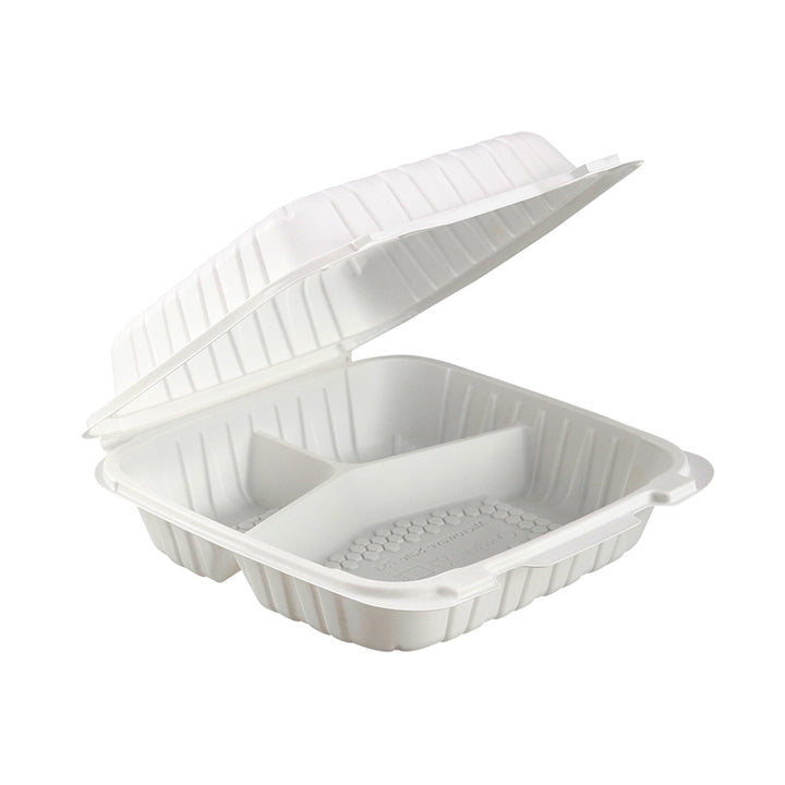 7.5"x7.5" 18 oz. 3-Compartment White Mineral-Filled Plastic Hinged Take-Out Container - 150/Case