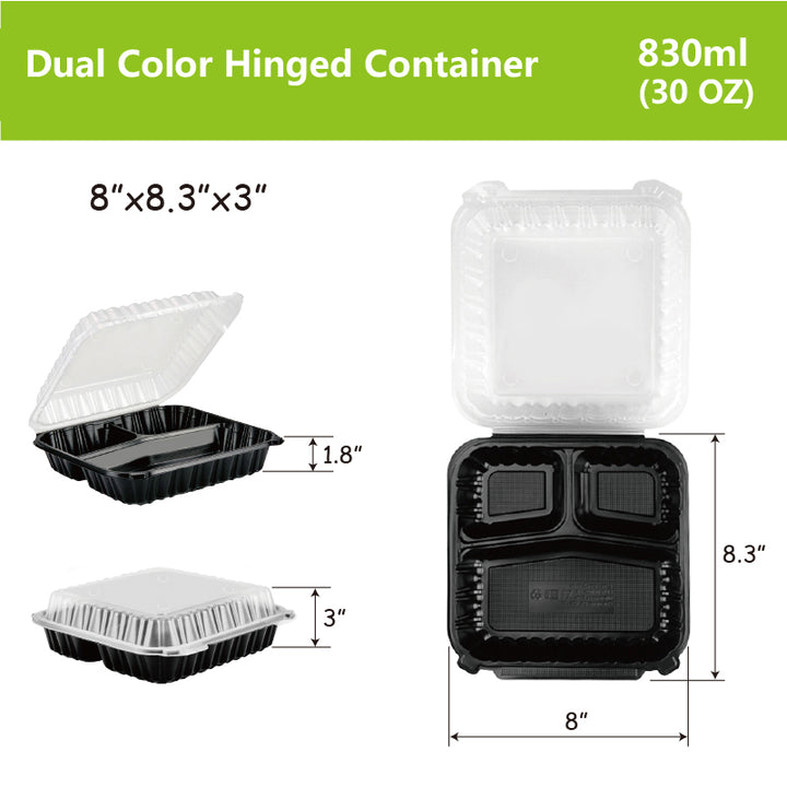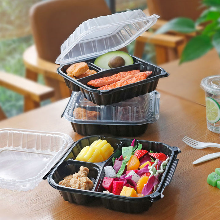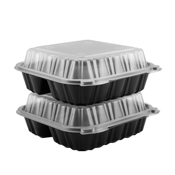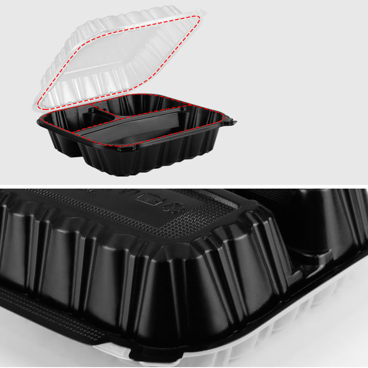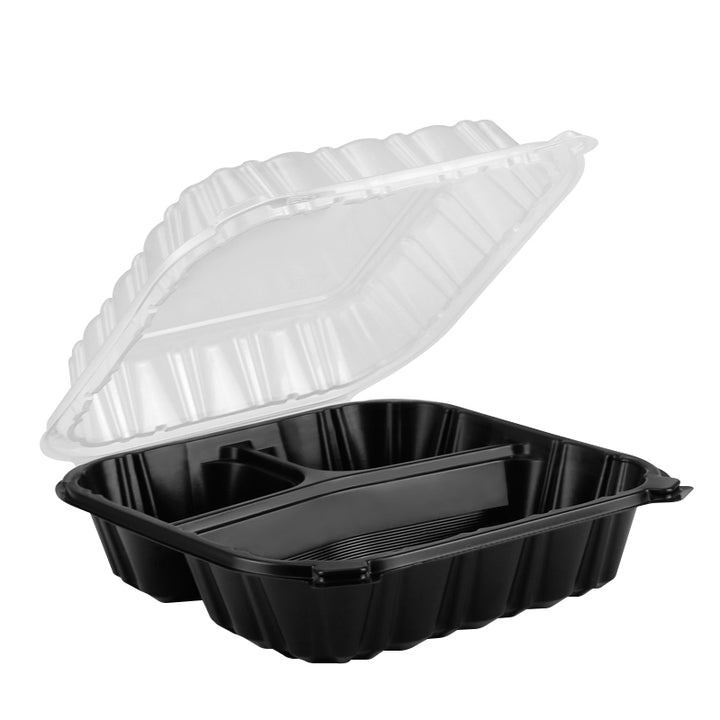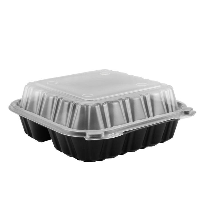 8"x8.3" 28 oz. 3-Compartment Black Plastic Hinged Take-Out Container - 100/Case