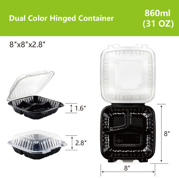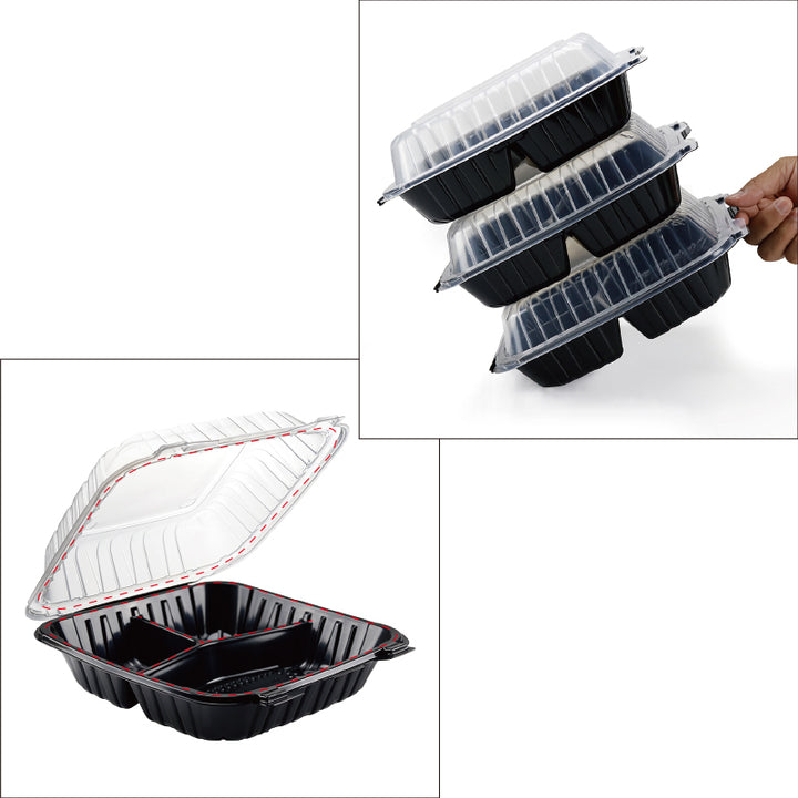 8"x8" 31 oz. 3-Compartment Black Plastic Hinged Take-Out Container - 150/Case